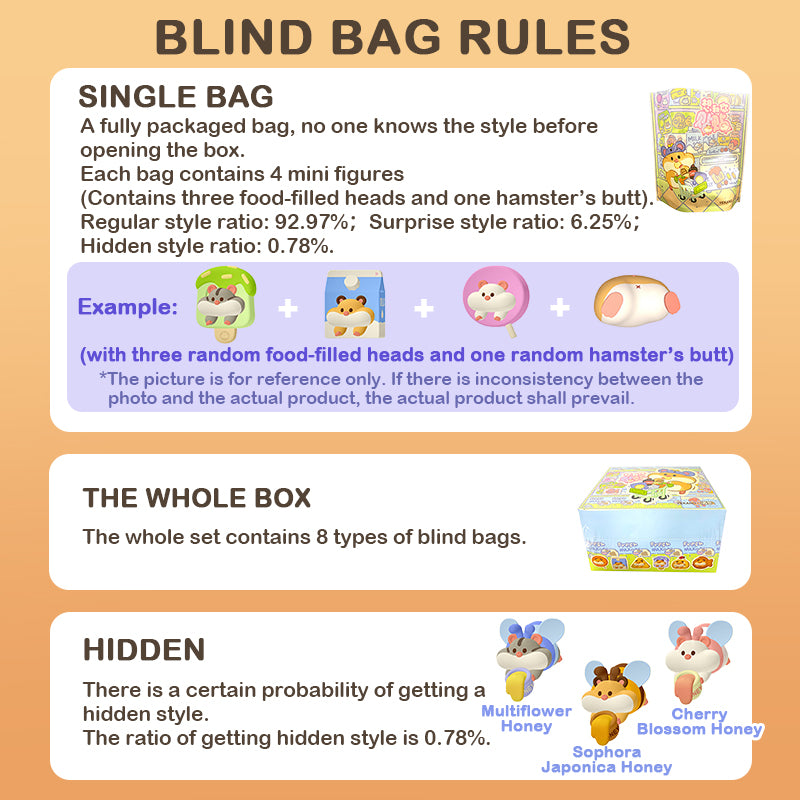 5. Buying Tips: Due to the special feature of blind bag, the brand assembles the styles based on the total production quantity. If you purchase multiple blind bags at once, or buy the same blind bag product in multiple orders, you might receive repeated figures, which is normal and not covered by after-sales services. Thanks for understanding.