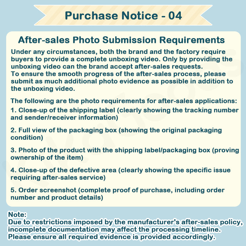 - For any cases, the brands and factories require the buyer to provide a complete unboxing video. Only with this, will your case be covered by their after-sales service. We KikaGoods will try our best to help you solve these issues and we appreciate your understanding of these cases requiring unboxing evidence.