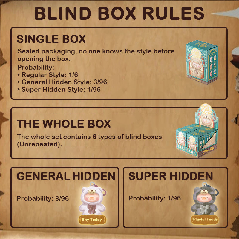 3. The production ratio of general hidden mini-figure (Shy Teddy) is 3/96, and the production ratio of super hidden mini-figure (Playful Teddy) is 1/96.